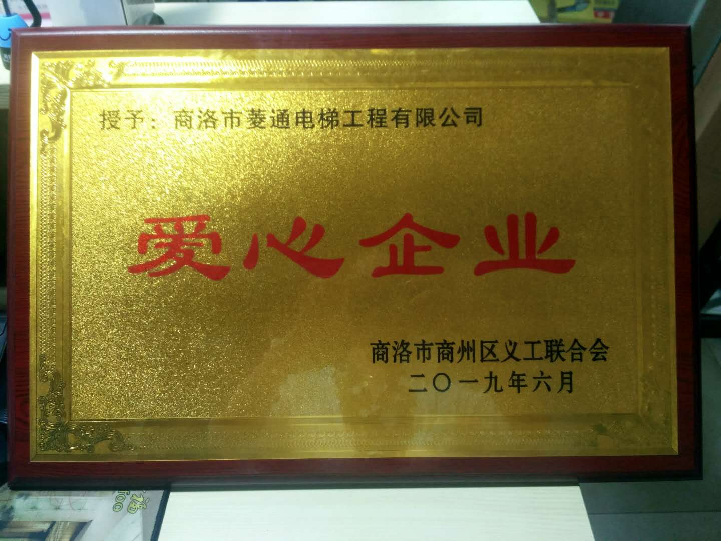 商洛市義工聯(lián)合會2019年6月,授予:商洛市菱通電梯工程有限公司愛心企業(yè)獎